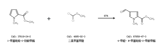 1.通过1-甲基吡咯-2-羧酸甲酯和二氯甲基甲醚合成4-甲醛- N-甲基吡咯-2-甲酸甲酯,收率约67%;