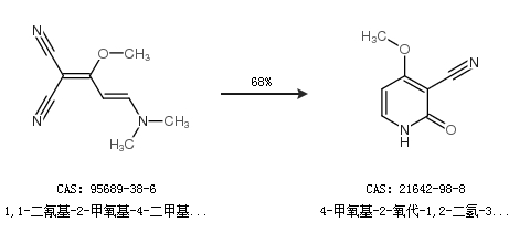 1.通过1,1-二氰基-2-甲氧基-4-二甲基氨基-1,3-丁二烯合成4-甲氧基-2-氧代-1,2-二氢-3-氰基吡啶,收率约68%;