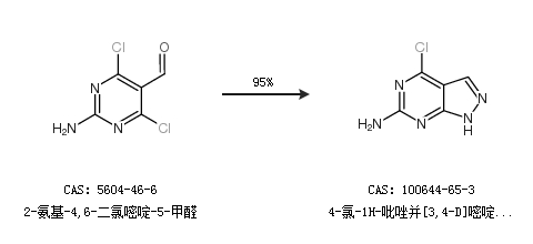 1.通过2-氨基-4,6-二氯嘧啶-5-甲醛合成4-氯-1H-吡唑并[3,4-D]嘧啶-6-胺,收率约95%;
