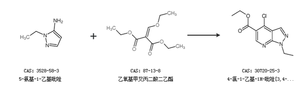1.通过5-氨基-1-乙基吡唑和乙氧基甲叉丙二酸二乙酯合成4-氯-1-乙基-1H-吡唑[3,4-b]吡啶-5-羧酸乙酯