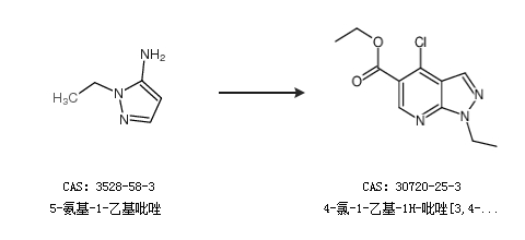 2.通过5-氨基-1-乙基吡唑合成4-氯-1-乙基-1H-吡唑[3,4-b]吡啶-5-羧酸乙酯