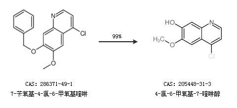2.通过7-苄氧基-4-氯-6-甲氧基喹啉合成4-氯-6-甲氧基-7-喹啉醇,收率约99%;