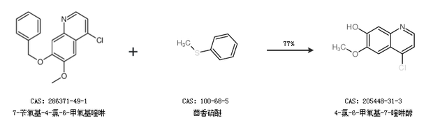 1.通过7-苄氧基-4-氯-6-甲氧基喹啉和茴香硫醚合成4-氯-6-甲氧基-7-喹啉醇,收率约77%;