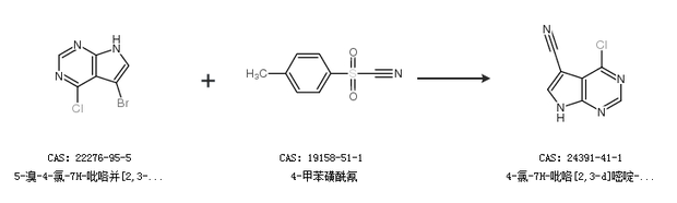 1.通过5-溴-4-氯-7H-吡咯并[2,3-d]嘧啶和4-甲苯磺酰氰合成4-氯-7H-吡咯[2,3-d]嘧啶-5-甲腈