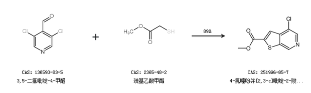 1.通过3,5-二氯吡啶-4-甲醛和巯基乙酸甲酯合成4-氯噻吩并[2,3-c]吡啶-2-羧酸甲酯,收率约89%;