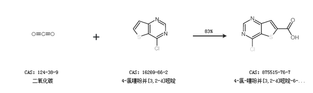 1.通过二氧化碳和4-氯噻吩并[3,2-d]嘧啶合成4-氯-噻吩并[3,2-d]嘧啶-6-羧酸,收率约83%;