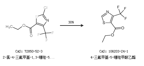 1.通过2-氯-4-三氟甲基-1,3-噻唑-5-羧酸乙酯合成4-三氟甲基-5-噻唑甲酸乙酯,收率约30%;