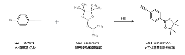 1.通过(4-溴苯基)乙炔和异丙醇频哪醇硼酸酯合成4-乙炔基苯硼酸频哪酯,收率约68%;