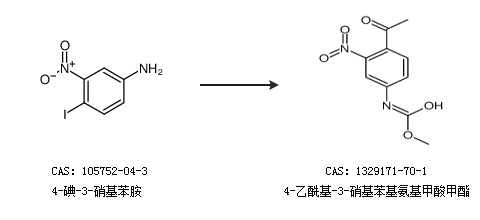 1.通过4-碘-3-硝基苯胺合成4-乙酰基-3-硝基苯基氨基甲酸甲酯
