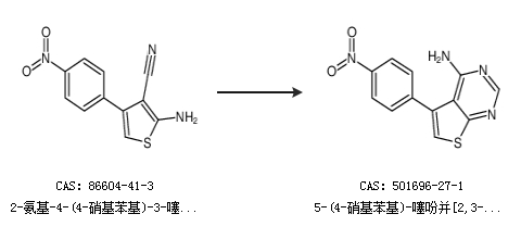 2.通过2-氨基-4-(4-硝基苯基)-3-噻吩甲腈合成5-(4-硝基苯基)-噻吩并[2,3-d]嘧啶-4-胺