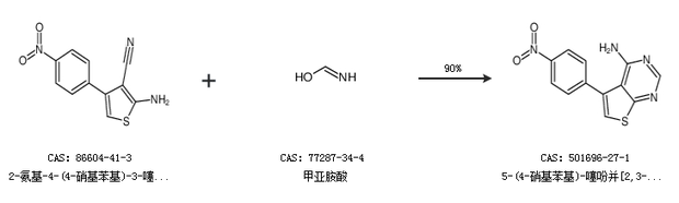 1.通过2-氨基-4-(4-硝基苯基)-3-噻吩甲腈和甲亚胺酸合成5-(4-硝基苯基)-噻吩并[2,3-d]嘧啶-4-胺,收率约90%;