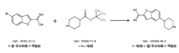 1.通过5-溴-苯并呋喃-2-甲酰胺和1-Boc-哌嗪合成5-(哌嗪-1-基)苯并呋喃-2-甲酰胺