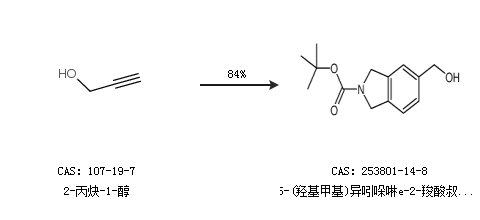 1.通过2-丙炔-1-醇合成5-(羟基甲基)异吲哚啉e-2-羧酸叔丁酯,收率约84%;