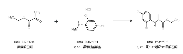 1.通过丙酮酸乙酯和2,4-二氯苯肼盐酸盐合成5,7-二氯-1H-吲哚-2-甲酸乙酯