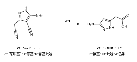1.通过3-(氰甲基)-4-氰基-5-氨基吡唑合成5-氨基-1H-吡唑-3-乙酸,收率约98%;