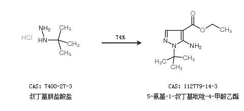 2.通过叔丁基肼盐酸盐合成5-氨基-1-叔丁基吡唑-4-甲酸乙酯,收率约74%;