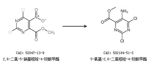 1.通过2,6-二氯-5-硝基嘧啶-4-羧酸甲酯合成5-氨基-2,6-二氯嘧啶-4-羧酸甲酯