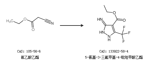 1.通过氰乙酸乙酯合成5-氨基-3-三氟甲基-4-吡唑甲酸乙酯