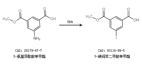 1.通过5-氨基异酞酸单甲酯合成5-碘间苯二甲酸单甲酯,收率约56%;