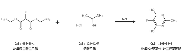 2.通过2-氟丙二酸二乙酯和盐酸乙脒合成5-氟-2-甲基-4,6-二羟基嘧啶,收率约62%;