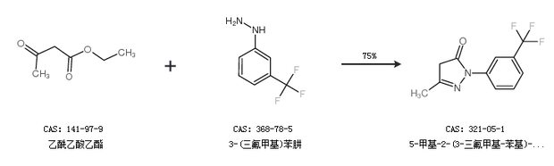 1.通过乙酰乙酸乙酯和3-(三氟甲基)苯肼合成5-甲基-2-(3-三氟甲基-苯基)-2,4-二氢-吡唑-3-酮,收率约75%;