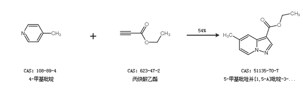 1.通过4-甲基吡啶和丙炔酸乙酯合成5-甲基吡唑并[1,5-A]吡啶-3-羧酸乙酯,收率约54%;