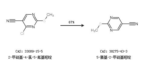 1.通过2-甲硫基-4-氯-5-氰基嘧啶合成5-腈基-2-甲硫基嘧啶,收率约67%;
