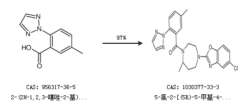 1.通过2-(2H-1,2,3-噻唑-2-基)-5-甲基苯甲酸合成5-氯-2-[(5R)-5-甲基-4-[5-甲基-2-(2H-1,2,3-三唑-2-基)苯甲酰基]-1,4-二氮杂环庚烷-1-基]-1,3-苯并恶唑,收率约97%;