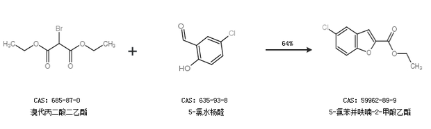 1.通过溴代丙二酸二乙酯和5-氯水杨醛合成5-氯苯并呋喃-2-甲酸乙酯,收率约64%;