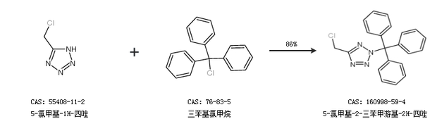 1.通过5-氯甲基-1H-四唑和三苯基氯甲烷合成5-氯甲基-2-三苯甲游基-2H-四唑,收率约86%;