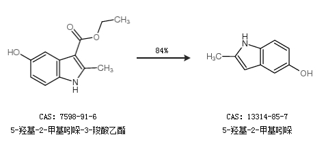 2.通过5-羟基-2-甲基吲哚-3-羧酸乙酯合成5-羟基-2-甲基吲哚,收率约84%;