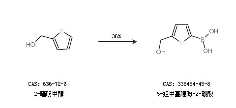 1.通过2-噻吩甲醇合成5-羟甲基噻吩-2-硼酸,收率约36%;