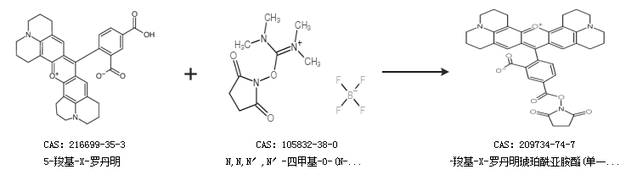 1.通过5-羧基-X-罗丹明和N,N,N′,N′-四甲基-O-(N-琥珀酰亚胺)脲四氟硼酸盐合成5-羧基-X-罗丹明琥珀酰亚胺酯(单一化合物)