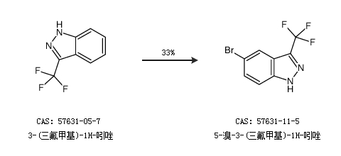 2.通过3-(三氟甲基)-1H-吲唑合成5-溴-3-(三氟甲基)-1H-吲唑,收率约33%;