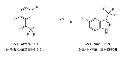 1.通过1-(5-溴-2-氟苯基)-2,2,2-三氟乙酮合成5-溴-3-(三氟甲基)-1H-吲唑,收率约43%;