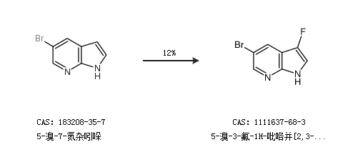 1.通过5-溴-7-氮杂吲哚合成5-溴-3-氟-1H-吡咯并[2,3-B]吡啶,收率约12%;