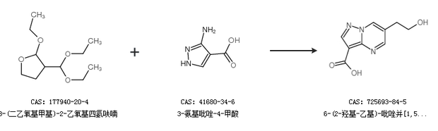1.通过3-(二乙氧基甲基)-2-乙氧基四氢呋喃和3-氨基吡唑-4-甲酸合成6-(2-羟基-乙基)-吡唑并[1,5-a]嘧啶-3-羧酸
