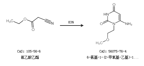 1.通过氰乙酸乙酯合成6-氨基-1-(2-甲氧基-乙基)-1H-嘧啶-2,4-二酮,收率约83%;