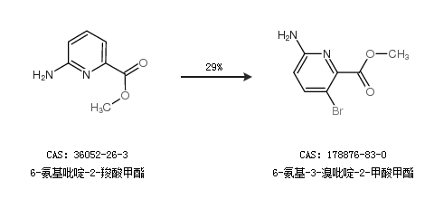 2.通过6-氨基吡啶-2-羧酸甲酯合成6-氨基-3-溴吡啶-2-甲酸甲酯,收率约29%;