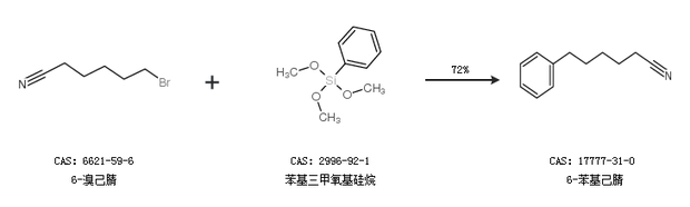 1.通过6-溴己腈和苯基三甲氧基硅烷合成6-苯基己腈,收率约72%;