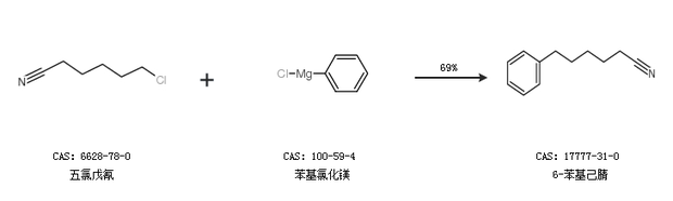 2.通过五氯戊氰和苯基氯化镁合成6-苯基己腈,收率约69%;