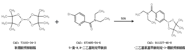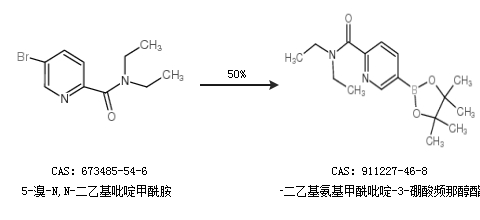 2.通过5-溴-N,N-二乙基吡啶甲酰胺合成6-二乙基氨基甲酰吡啶-3-硼酸频那醇酯,收率约50%;