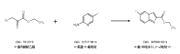 1.通过3-溴丙酮酸乙酯和2-氨基-5-氟吡啶合成6-氟-咪唑并[1,2-a]吡啶-2-羧酸乙酯