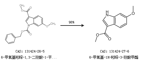 1.通过6-甲氧基吲哚-1,3-二羧酸-1-苄基-3-甲酯合成6-甲氧基-1H-吲哚-3-羧酸甲酯,收率约98%;