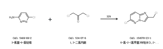 1.通过3-氨基-6-氯哒嗪和1,3-二氯丙酮合成6-氯-2-(氯甲基)咪唑并[1,2-b]吡哒嗪,收率约32%;
