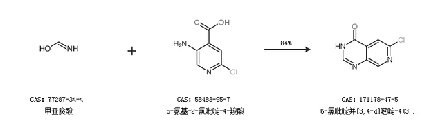 2.通过甲亚胺酸和5-氨基-2-氯吡啶-4-羧酸合成6-氯吡啶并[3,4-d]嘧啶-4(3H)-酮,收率约84%;