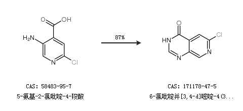 1.通过5-氨基-2-氯吡啶-4-羧酸合成6-氯吡啶并[3,4-d]嘧啶-4(3H)-酮,收率约87%;