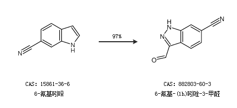1.通过6-氰基吲哚合成6-氰基-(1h)吲唑-3-甲醛,收率约97%;