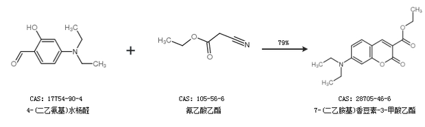 1.通过4-(二乙氨基)水杨醛和氰乙酸乙酯合成7-(二乙胺基)香豆素-3-甲酸乙酯,收率约79%;