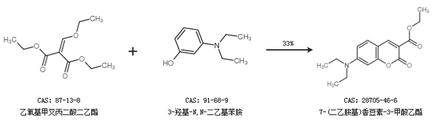 2.通过乙氧基甲叉丙二酸二乙酯和3-羟基-N,N-二乙基苯胺合成7-(二乙胺基)香豆素-3-甲酸乙酯,收率约33%;